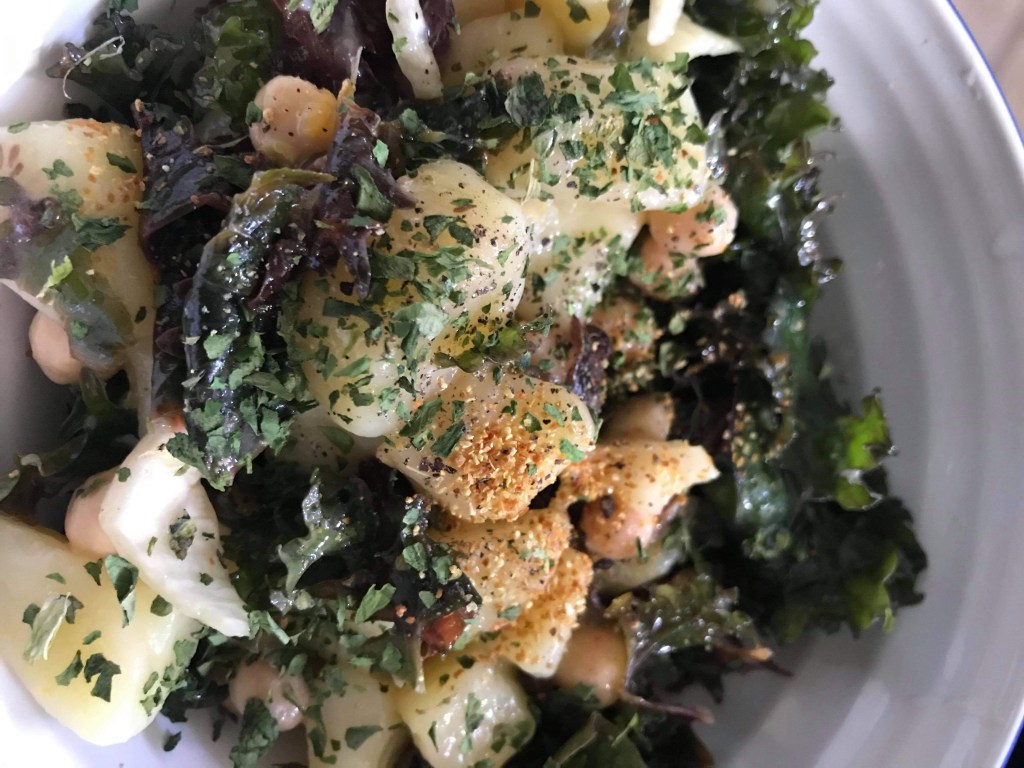 I used to eat this all the time in the early years of my veg box because I was almost always guaranteed amazing kale and potatoes. I eventually started to use my kale and potatoes in other things, but I decided to go back to this favourite. It is simple and easy. I usually make this salad with kale and potato base and then add other things I have in my veg box. This time I added fennel and chickpeas. I have also added some combination of nondairy/dairy feta, smoked tofu, brown rice, various nuts and seeds, and avocado. Basically whatever odds and ends I have kicking around.