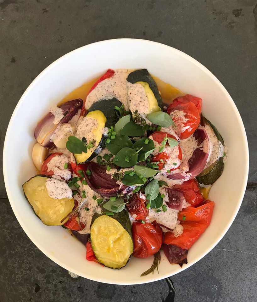 My friend Sarah said this was super yummy. The recipe looked meh. But she was right. It is pretty yummy. It is Nigel Slater’s roasted peppers, zucchini/courgette, shallot, and cherry tomatoes with rosemary, with a yogurt and sumac sauce, mixed with the juice and oil from the roasted veg. The original recipe is here and says serves 2, I’d say 4 as a side: https://www.theguardian.com/food/2019/jul/09/nigel-slater-midweek-meal-supper-roast-peppers-summer-vegetables. I had most of the required veg in my veg box and a pile of fresh herbs gifted to me from my good friend Lesley, so decided to give it a go. Really simple, really pretty, and really better than you would think. Below is the slightly modified version of Nigel’s recipe based on what I had in my veg box and kitchen.