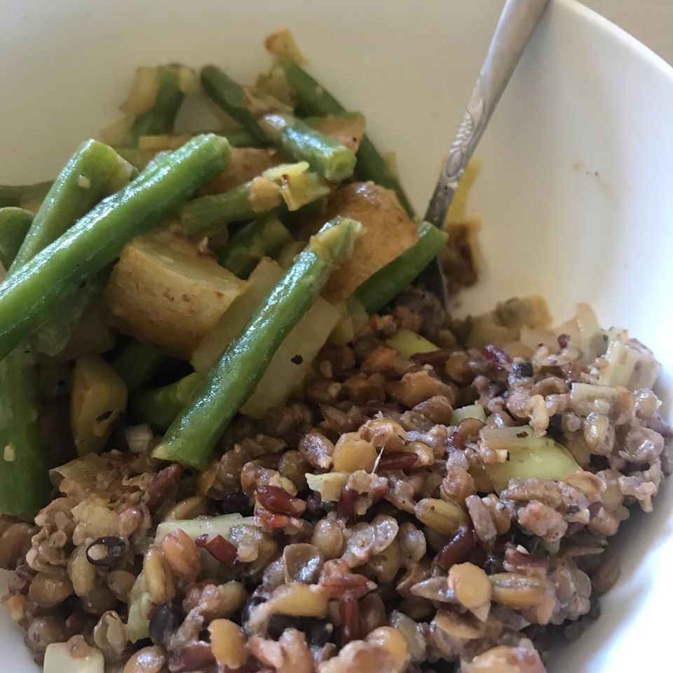 For some reason I have so many leeks building up from my veg box past and present. And I’m just not getting through the leeks, given the slow pace I’m cooking them. In any case, I sautéed one measly leek while I tried to sort out what to do for the rest of my dinner. Steamed green beans and boiled potatoes were tossed in the pan with half the sautéed leeks and mixed around with Dijon, roasted dehydrated garlic, lemon, and more oil. The other half of the sautéed leek was tossed with a can of lentils and bag of random mixed grains (quinoa, wheat berries, brown rice) and then tossed with sauce made tahini, lemon, sumac, powdered garlic, salt, and a bit of hot water. I’m a fan of small bags of precooked grains. I realise I can cook grains, but today I didn’t feel like doing it or cleaning another pot. And I admit, I’m impressed with all the exciting grains in this package of perfectly cooked ready to eat grains.