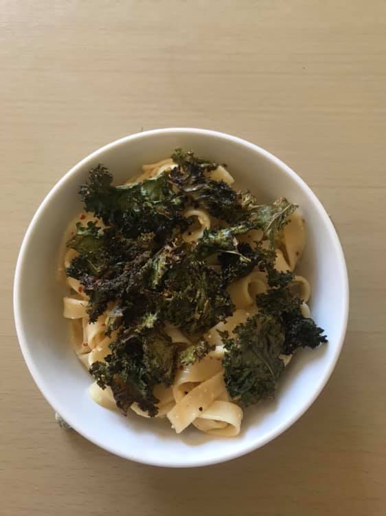 I make kale chips a lot. In fact, almost every time I get curly kale in my veg box I make kale chips. My kale chips taste more like the yummy sauce from a late night kebab truck than a trendy leafy green. Today I made lemon garlic chilli pasta (really just pasta with lemon, olive oil, garlic, and Aleppo chilli) because I was too meh to make anything else. I topped it with kale chips because I didn’t have Parmesan cheese or tomatoes or really anything else that I could manage on minimal effort. Turns out, kebab truck kale chips are kinda great on lemony garlic pasta.