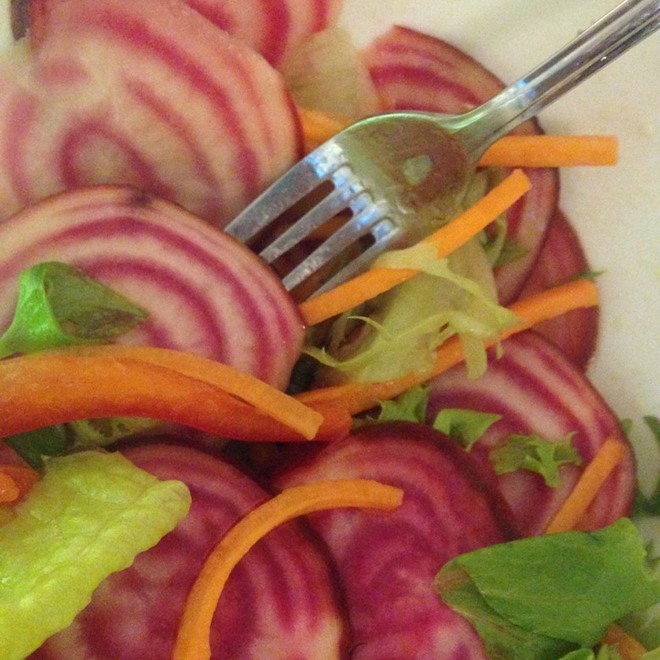 My veg box arrived with exciting beets! I’ve discovered candy cane beets are super pretty and surprisingly sweet and not overwhelmingly earthy. I ended up with a bunch of small lemons this week, so this is a raw beet salad with a quick lemon, olive oil, Dijon, dressing (if you struggle with a vinaigrette, I used 2:1 ratio of oil to lemon and a wee bit of dijon to bind it all). If you think I have fancy knife skills, I don’t. I have a mandolin, which is why I have perfect paper-thin beet slices.