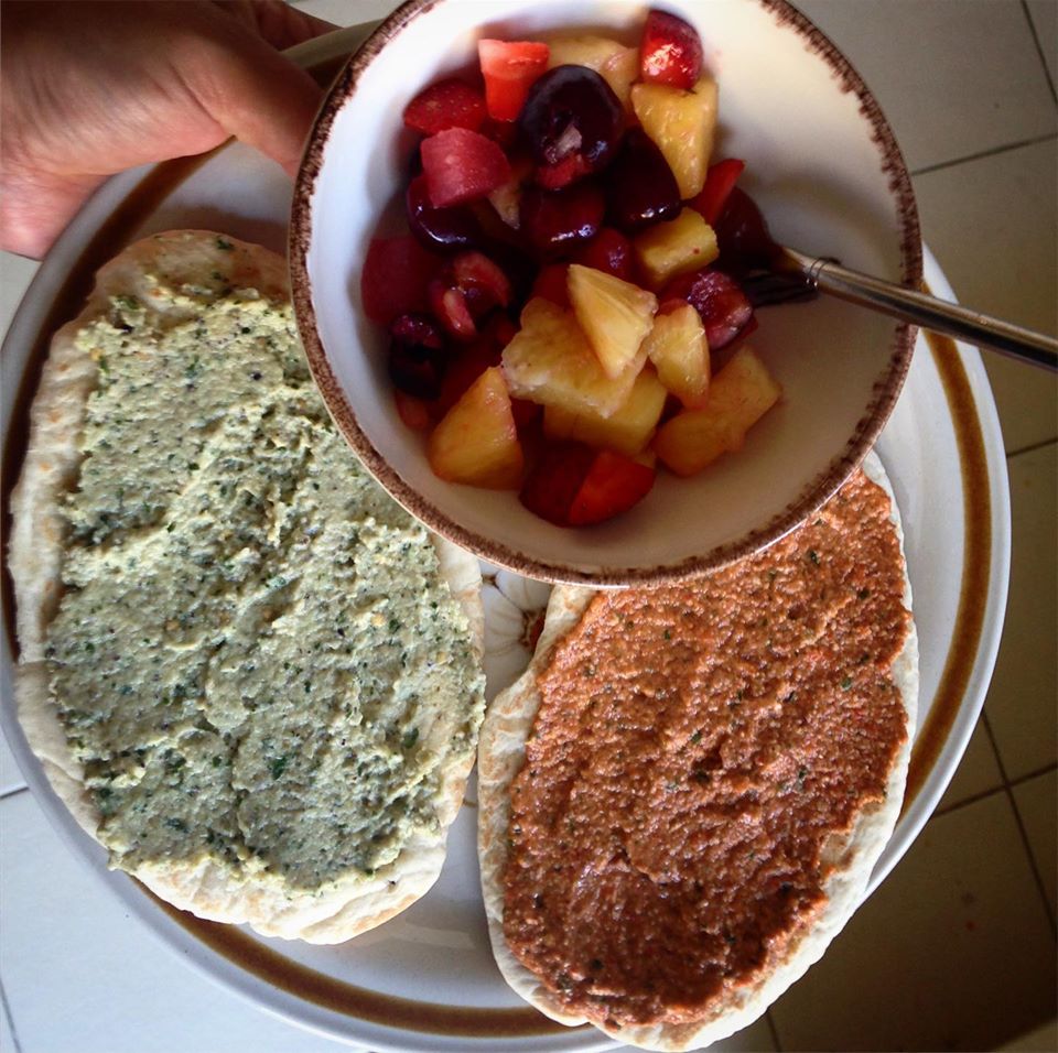 I had some veg that was great for grilling in my veg box, and I decided to grill them and make them into dips: smoky, herby aubergine/eggplant dip and roast red pepper dip. The first time I tried making dips (as seen in this photo), I blended the veg pretty smooth. It was okay, but I think I prefer a bit more of a chunkier texture, which is why the subsequent times I made these ( and forgot to take photos). Because most store bought fruit salads have all the crap I’m allergic to (apples, bananas, cantaloupe, honey dew melons), I’ve decided to make my own with bright colours that make me happy (pineapple, watermelon, cherries, strawberries). Happy lunch!