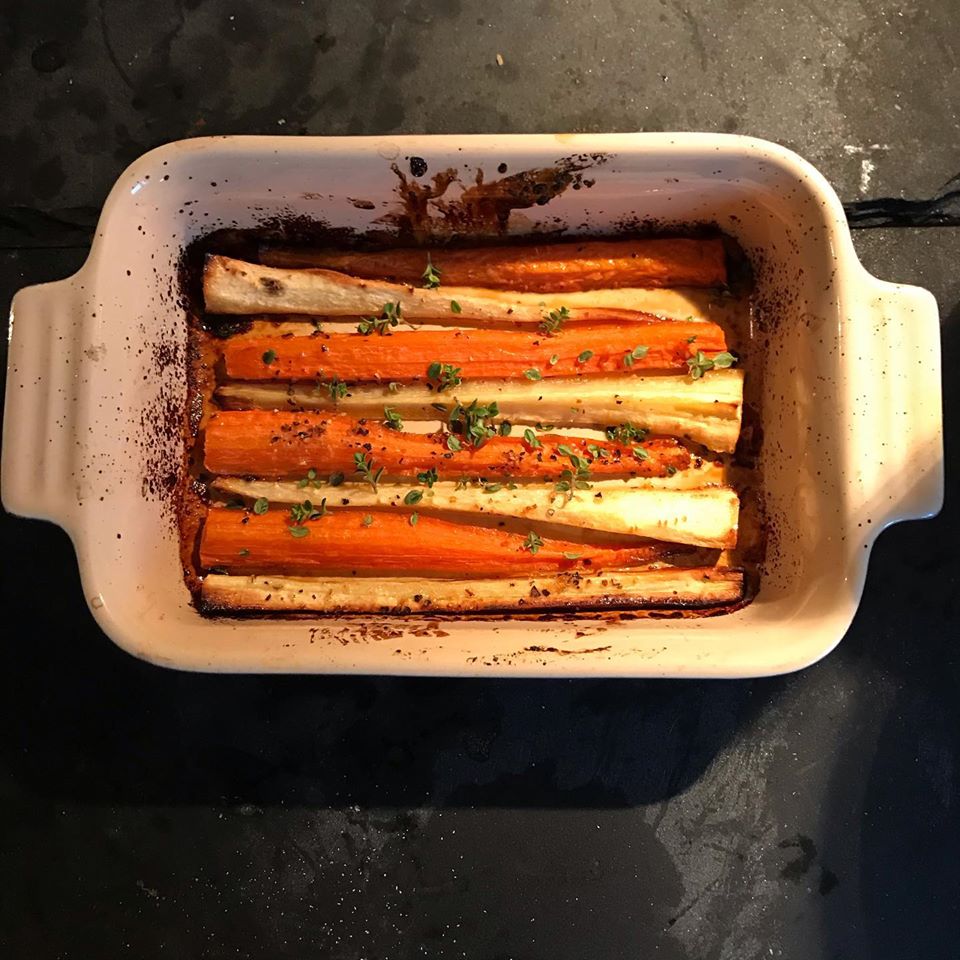 The parsnips and carrots in my veg box were gorgeous and giant! I decided to roast a couple in my wee pan with a bit of oil, truffle honey (although regular honey would be just fine). In this photo I quartered one large, fat carrot and one medium, fat parsnip, tossed it with a tablespoon of oil, a teaspoon of honey you like (I used truffle honey), a dash of lemon pepper (but regular pepper would do) and salt. a hot oven (200C/400F) for about 35 mins. I topped it with some fresh lemon thyme (the only herb I don’t manage to kill). Really lovely.