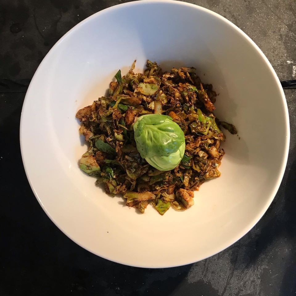 This week I have a bag of Brussels sprouts. I won’t lie, they aren’t my favourite, no matter how cute they look. Today I decided to slice finely a dozen or so sprouts, and pan fry them in olive oil, a teaspoon of garlic powder, and about 1/2 teaspoon each of smoked paprika and ancho chilli powder my lovely friend Sabine gifted me. After about 5 mins or so it looked fine and I finished it with a squeeze of lemon and smoked sea salt. This is my new favourite way of eating sprouts!