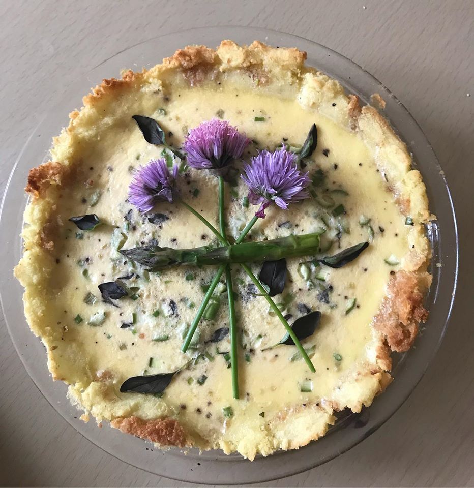 This is the prettiest quiche I’ve made in a long while. It is an asparagus and herb quiche, but really any quiche works in this cheater hashbrown crust. I basically crumbled and mashed tater tots into a crust. It is cheap, yummy, and easy.