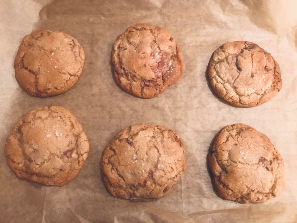- Arrange on the prepared pans, leaving a lot of space in between each (I put 6 on a regular baking sheet). Sprinkle with sea salt. Bake until the tops are cracked and lightly golden, yet still soft at the centre, about 10 to 12 minutes, rotating the pan halfway through cooking. Leave the cookies on the sheet pan for 2 minutes, then transfer to a wire rack to cool.