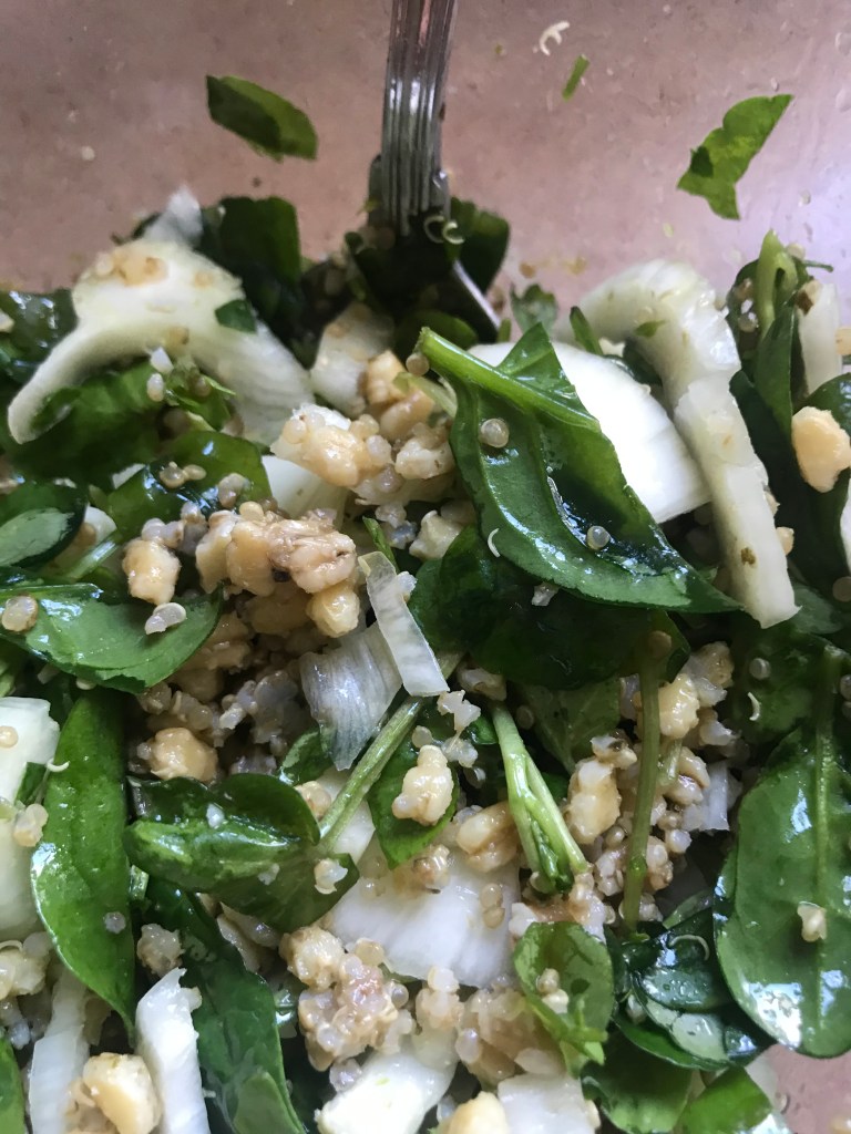 Sometimes things are just really hard and you don’t need food to be the hardest. My little co-op has exciting ready-to-eat grains in a bag. This salad features a pesto quinoa and wheat berry ready-to-eat bag of grains. I mixed the grains bag with a ready-to-eat mixed greens bag, some extra olive oil and lemon juice (from the bottle, because I’m all about easy at the moment) and half a small fennel from my veg box sliced up (in case you thought this was the great onion salad). Feel free to add more to this salad, but if you want fast, easy, and nice, this checks those boxes.