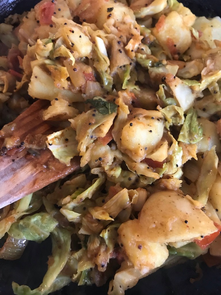 My veg box had a wonderful small cabbage and a couple of tomatoes, so I decided to try out Meera Sodha’s cabbage and potato curry. This recipe is easy and seriously satisfying. It isn’t terribly quick (it takes a while for all the parts to cook), uses spices that maybe not everyone has in their kitchen (black mustard seeds and fenugreek leaves, and I added curry leaves), but it is worth it and makes for excellent leftovers! It is one of those recipes that I’ve been looking at for months and thought it looked kinda “meh” but since I had the right potatoes and cabbage, I thought I’d give it a go. No regrets. Much happiness. Here is the recipe: