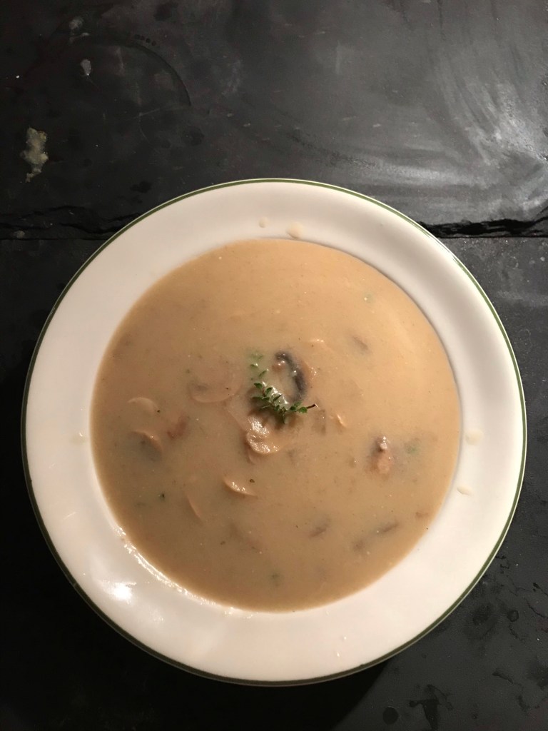 You’ll need a lot of sliced mushrooms (maybe 200g), an diced onion, a chopped potato, some olive oil, a couple of stock cubes, the dairy you like (I used oat milk, some nutritional yeast, lemon juice, and the herbs you like with mushrooms (I used thyme and chives, but tarragon would also be nice), a big pot and a smaller pot.