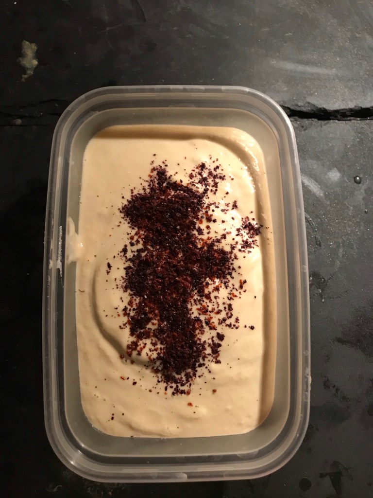 Yah, she is right. It is amazing. Seriously the best hummus you can make with a can of chickpeas in 2 mins. I drained a bit of the chickpea water because I didn’t want it quite so runny, but save it for other things or to add it back it you need to smooth it out. I added 2 tbsps of lemon rather than 1, 1 tsp of garlic powder (or fresh garlic if you like a more aggressive garlic flavour), and topped it with some sumac and Aleppo chilli pepper.