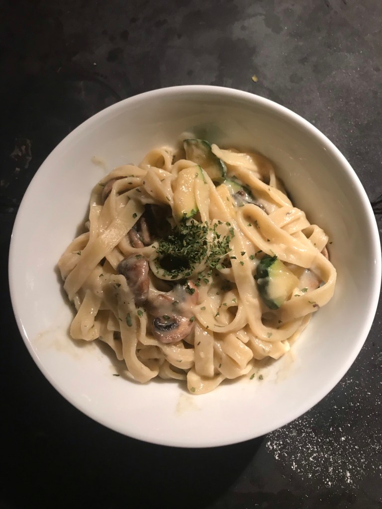 I had a really lovely courgette/zucchini this week, so I used part of it and some of the mushrooms in my box to make a creamy lemon, courgette, mushroom pasta using oatmilk.