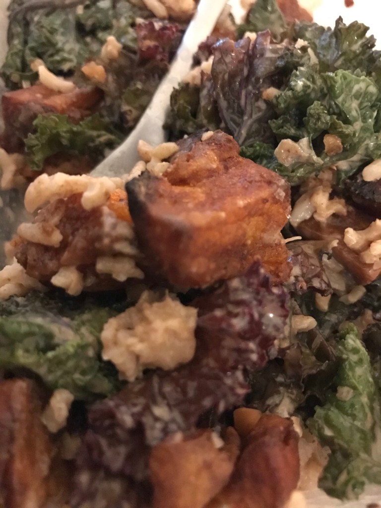 Add some dressing to steamed greens and rice and mix. Add sweet potatoes and top with more dressing.