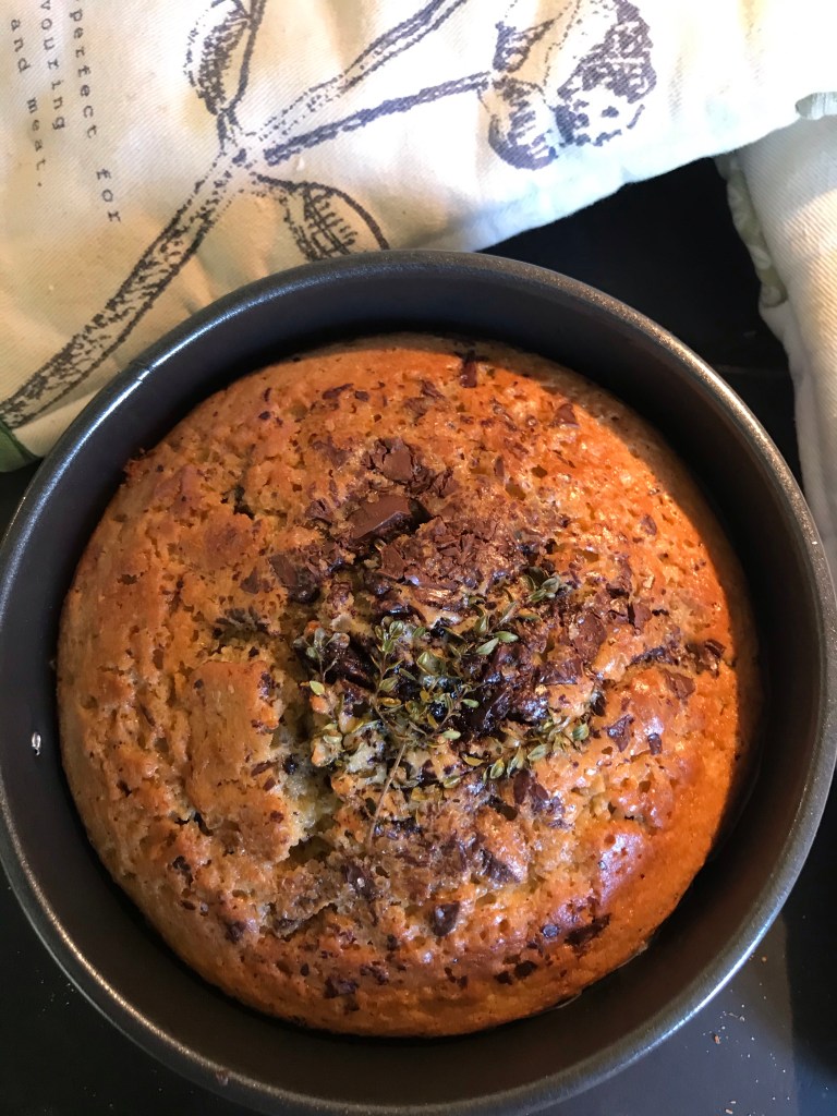 This is half the recipe of Anna Jones’s cake in my tiny 6” cake pan. Since you can’t really use 1.5 eggs, I used 2. You might be able to get away with ground flax as an egg replacement here, I haven’t tried. I chopped up a dark chocolate bar with a knife and made sure to have some biggish chunks and include all the bits and chocolate shavings in the dough. The biggish chunks of chocolate, we agreed, were important. I also put a few sprigs of lemon thyme and Demerara sugar on the top because I’m fancy like that. It is resplendent. Make this cake. You won’t regret it. Unless you’re allergic to the ingredients, then you will regret it, in which case don’t make this cake. FYI, the vegan chocolate cake in this column is also amazing.