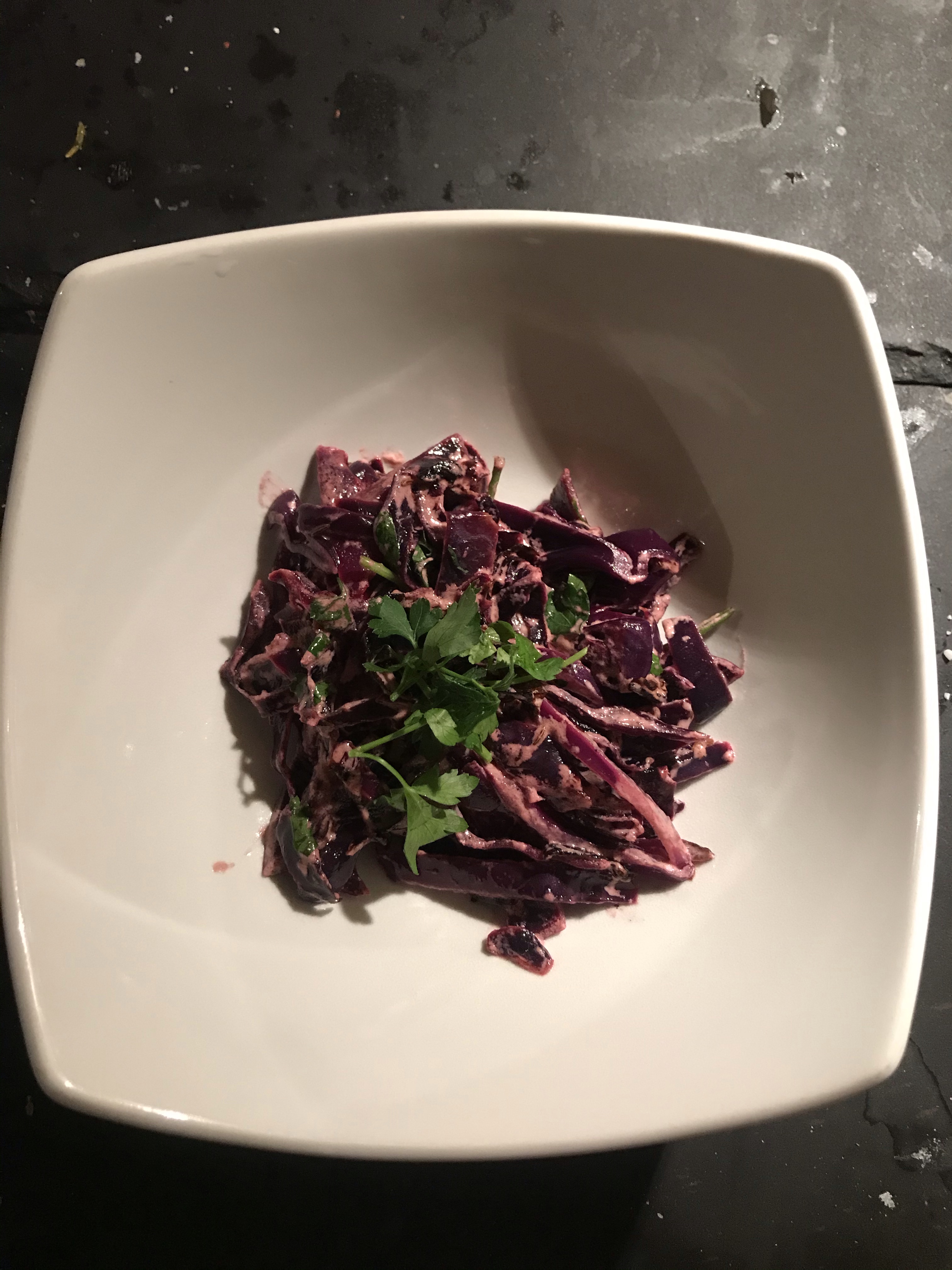 Accompanying my protein is some pretty tasty sautéed purple cabbage. Turns out, if you slice it thinly, it cooks up in about 10-15 mins sautéed in a little oil and caraway seeds and salt. Also, it really shines if you finish it with a splash of lemon, parsley (dill would also work), and a couple of tablespoons of whatever non-dairy or dairy sour cream or yogurt you have kicking around (i.e., when it is done cooking, add these things in and stir). It has some good crunch and is really satisfying!
