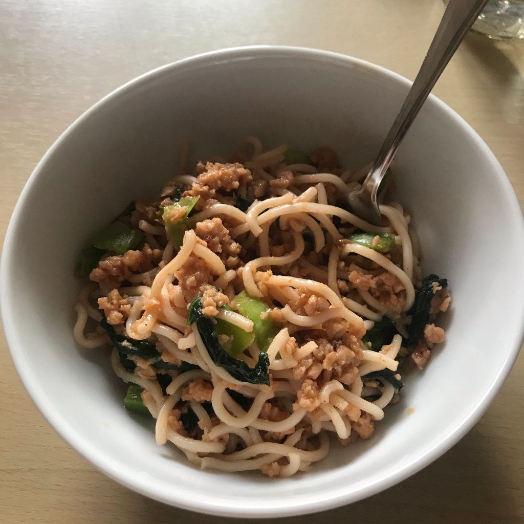 In a big pan add a slosh of oil. When hot add some garlic and ginger paste (or chopped garlic and ginger, or add garlic and ginger powder to the mince) and stir around, then add mince of your choice (I used vegan mince, but use what you have). Then add whatever chopped greens you have. I used my pakchoi/bokchoy, My vegan mince dries up pretty quick, so I had to add some water to the pan periodically to keep things a bit wet as everything cooked. When things looked mostly done, add the cooked noodles of your choice. I had some ready to go udon noodles, but rice noodles or even cooked spaghetti noodles would be fine. In a big bowl, mix 3 tablespoons of soy sauce, 2 teaspoons of sesame oil, 1 teaspoon of chili oil, 1 teaspoon of vinegar, and a pinch of sugar. Toss everything from frying pan into the big bowl and mix. Done!