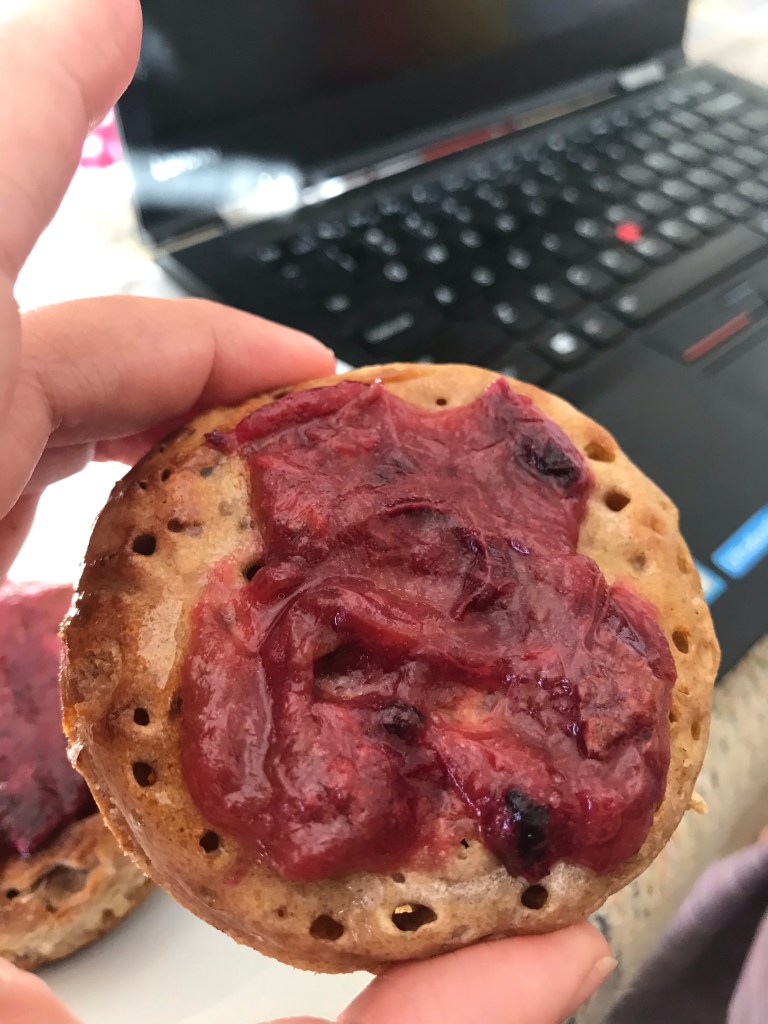 Here is something super easy if you have rhubarb! Rhubarb compote. It is kinda like jam, except it isn’t really jam and you make it in the oven with no effort. It is yummy on crumpets (seen here), also on yogurt.
