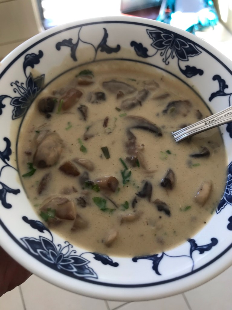 Once all the mushrooms are done and in the onion pot, turn the heat up to medium/high and sprinkle the flour on the mushrooms and onions. Stir that around for a few minutes, then add a big splash of booze. Traditionally I guess this would be sherry or white wine. I have neither of those kicking around. Okay, I might have a bottle of white, but I wasn’t opening it for soup. What I do have is a lot of whisky. Turns out, whisky is really a solid choice in mushroom soup. I feel like Scotland would approve this choice. Cook off the booze, then add the stock and bring to a simmer. Cook for a few minutes longer until the soup has thickened a bit and become smooth. Add your herbs (I used parsley, chives, and tarragon), and the available product you have to make it creamy. Stir and done! Good immediately, better the next day.