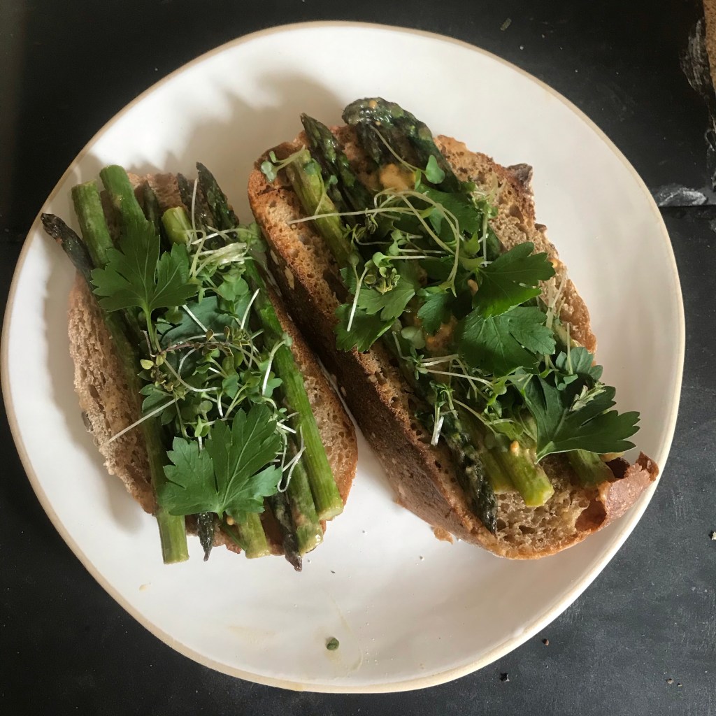Heat a pan with some oil on medium/high. Pop in the asparagus, some salt and pepper, and garlic (powder or fresh). Sauté for a minute or two and add a big splash of water and cook until most of the water is gone. Add 1/2tsp of Dijon and 1/2 tsp of seedy mustard, a big squeeze of lemon, and a tablespoon of non-dairy or dairy butter. Take off the heat and mix in the pan. Pour on toast, top with herbs.