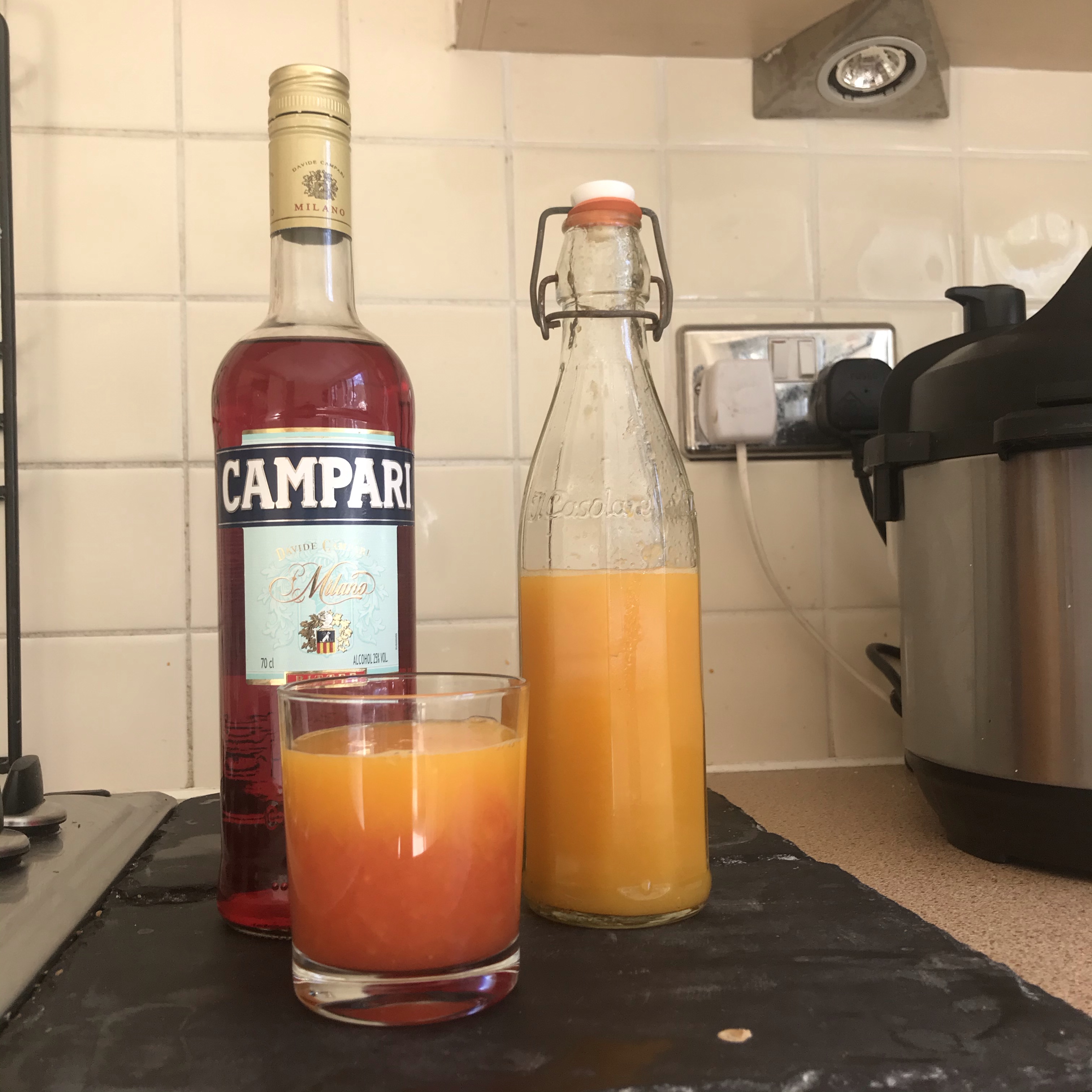 It is Friday. I had some really nice oranges in my veg box. You know what you can do with oranges? Make some really nice juice. Nothing says happy like some freshly squeezed orange juice at breakfast. You know what else? After 5pm, you can add some Campari and have some REALLY nice juice. And it is super pretty. It would be prettier if I had bothered with a garnish, but oh well.