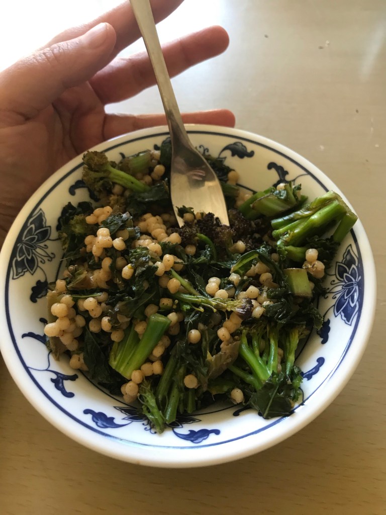 Make your noodles or giant couscous. While the carbs are cooking, chop up your kale and broccoli into bite-sized salad pieces. Heat up some olive oil in a pan. Add the pepper you like (Aleppo, hot pepper flakes, Korean chilli pepper powder, whatever), salt, and some garlic and ginger (fresh, powder, paste, whatever you’ve got) and stir it around. Add your greens and sauté on medium/high until everything is a beautiful green and cooked the way you like your greens. If the pan looks too dry or if things look like they are burning, add a splash of water. Take the pan off the heat, add a bit of oil, non-dairy or dairy butter, and the drained couscous and give it a big stir. Add some more of anything if it needs it, spice-wise. You can add a squeeze of lemon of lime if you like. Done.
