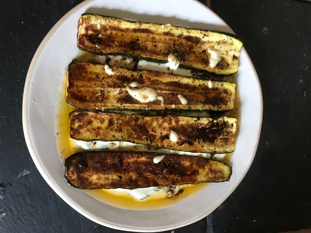 Slice 2 courgette/zucchini into very thick long strips. Toss in olive oil, salt, and pepper, and put on the middle rack under the broiler until they look grilled and charred. You need to keep watching them so they don’t burn.