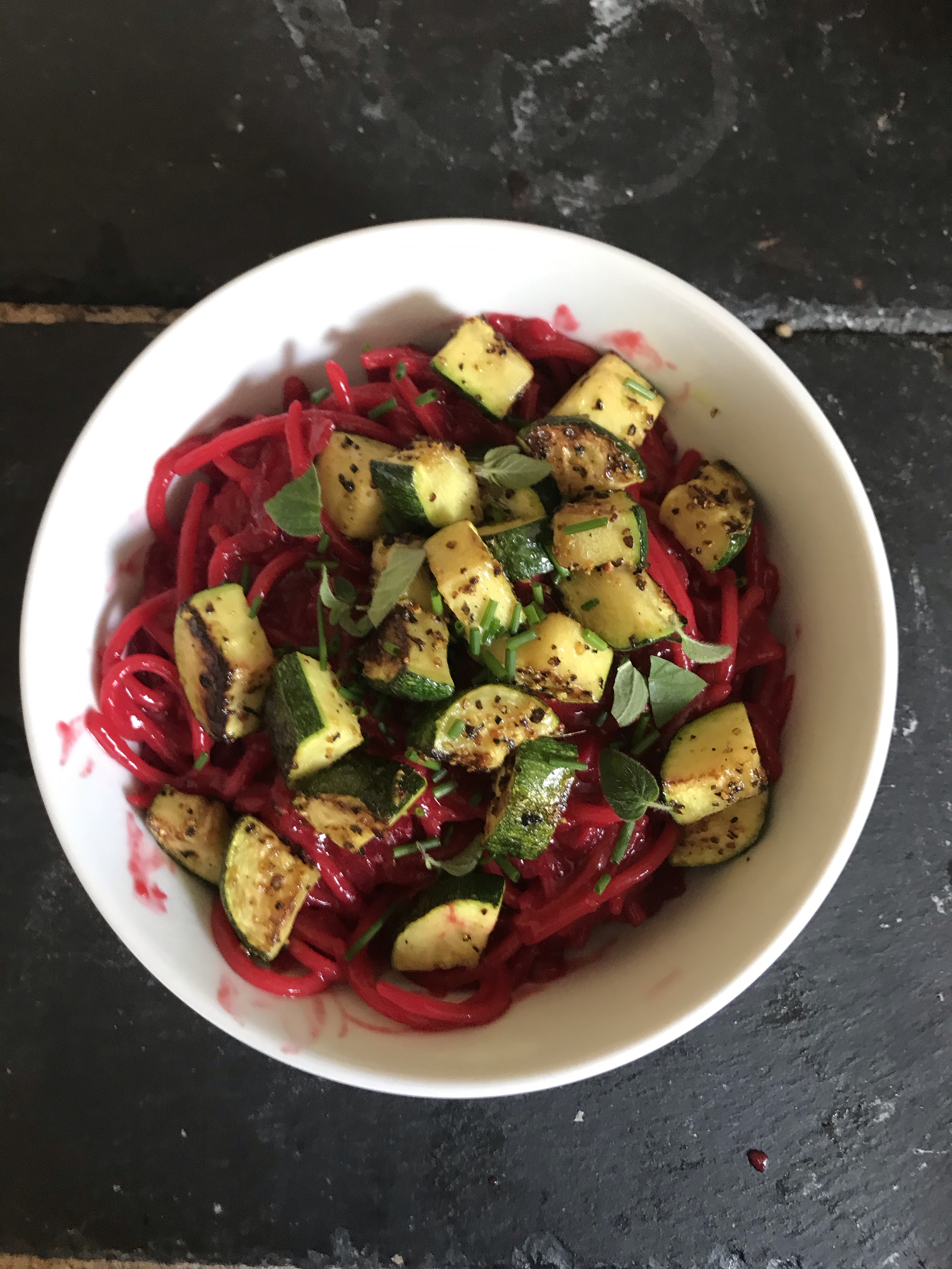 While the pasta is cooking sauté your courgette/zucchini in a pan with some olive oil and lemon pepper and garlic. When pasta is done, dump into bowls, add some fresh herbs (I added fresh chives and oregano because that is what I’m growing) and your courgette/zucchini. If you wanna guild the lily (and why not) add a dollop of whatever non-dairy or dairy creamy stuff you like.