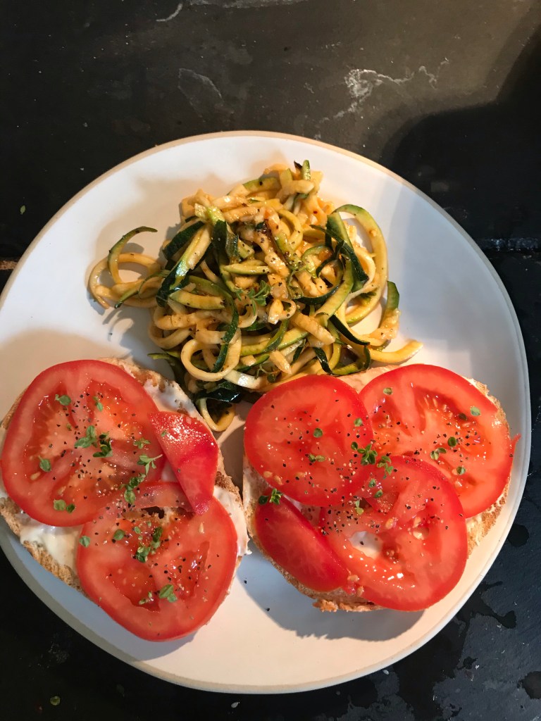 The salad is raw courgette/zucchini which I did as noodles in a spiralizer, but it would work just as well as ribbons using a vegetable peeler or mandolin. I made a dressing using about 1/4c oil, 1/2 lemon, a squeeze of tomato paste, a pinch of garlic powder, lemon pepper, and ancho pepper flakes. And a sprinkle of sugar and some fresh herbs (I used thyme, chives, and oregano). Whisked it all together and tossed it with the courgette/zucchini.