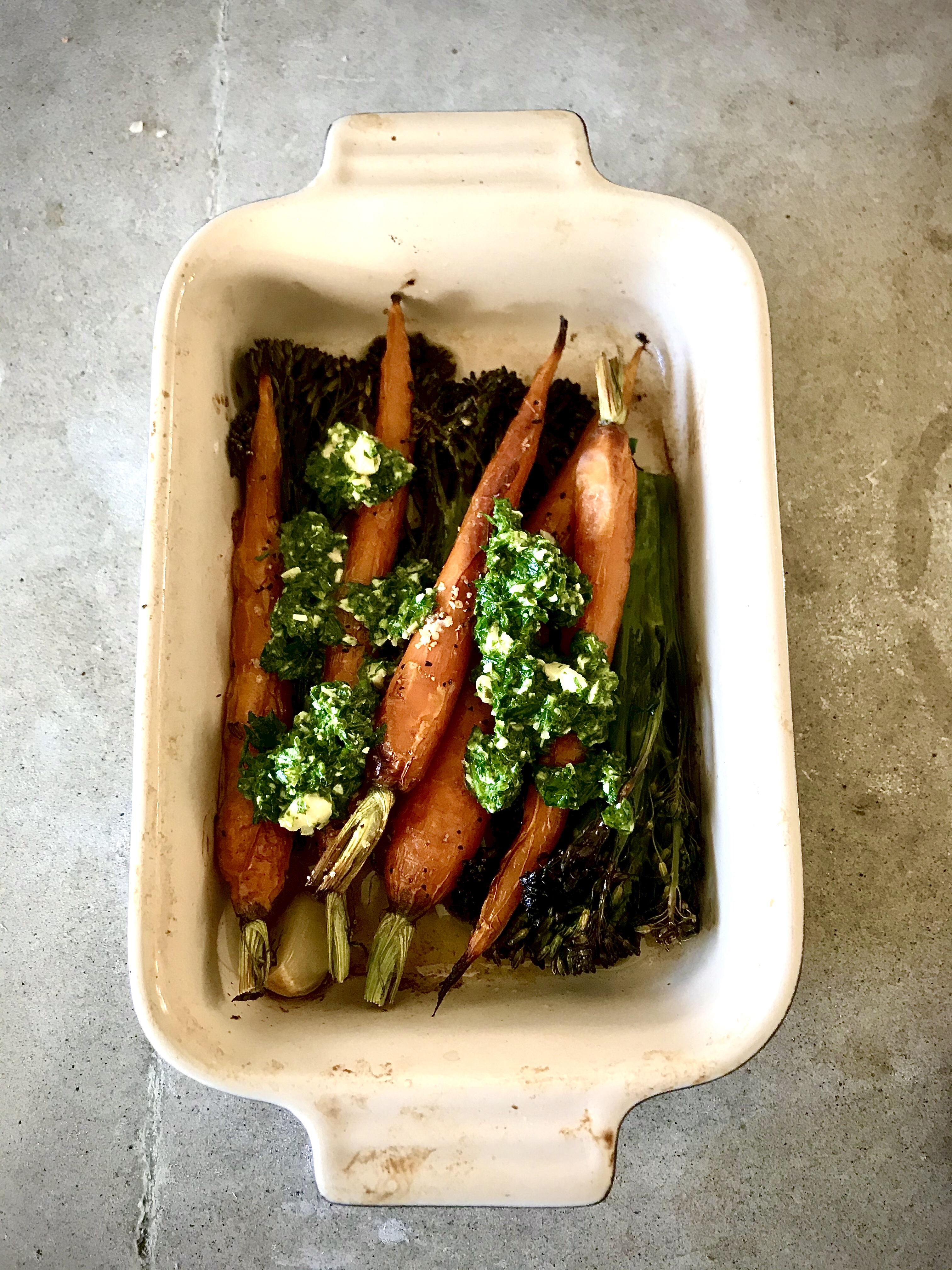 My veg box came with easily the most gorgeous bouquet of carrots I’ve ever seen. It was almost a shame to eat them, they were so pretty! Then I remembered a friend of mine brought amazing carrot top pesto for a Canada Day potluck and so I figured why not try my hand at it because it was delicious when she made it and it would be a shame to waste half the bouquet. I roasted some of the carrots with some broccoli, and added garlic and rosemary gifted to me by my lovely friend Lesley (she has a magnificent garden). The carrot top pesto is vegan and not the least bit Italian, but if you like bright, herby, lemony things, it is rather nice. Here is what I did.