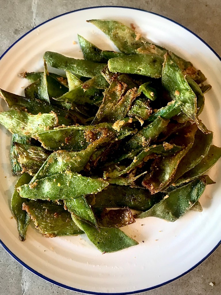 Half and slice a handful or so of empty pods on an angle. Make a spiced flour mix and put that in a bowl. I used maybe 1/4c of flour, and a teaspoon each of smoked paprika, onion powder, garlic powder, and a pinch of salt, and pepper. In another bowl, put some non dairy or dairy milk. Dip your pods in the milk, and toss them in the spiced flour. Heat about 1 inch of neutral oil (I used veg oil) in a deep pan, drop in one pod, and when it bubbles and rises to the surface, add the rest of the pods. Fry until golden brown, turning to make sure they’re all evenly cooked. Done and done.
