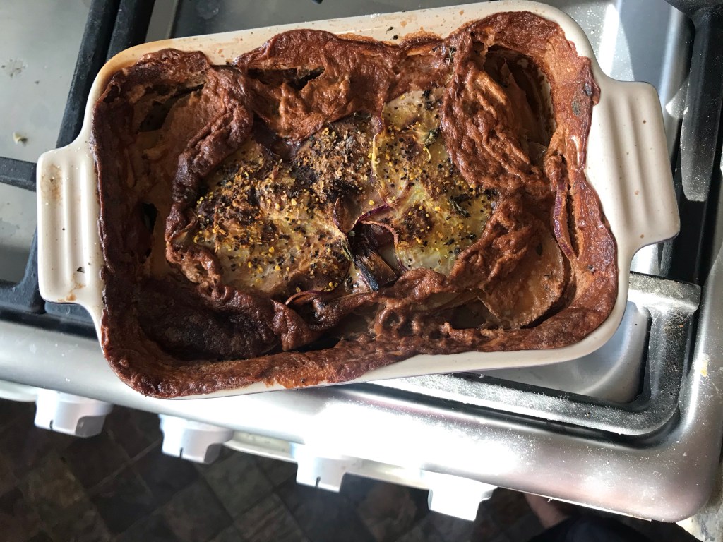 Kohlrabi is amazing raw, but it also amazing baked. A super easy thing to do is make kohlrabi/potato dauphinoise. Traditionally, this is just potatoes, cream, and garlic, but I had some onions kicking around so I threw them in as well. I used 2/3 kohlrabi, 1/3 potatoes, and use whatever cream you have kicking around (oatley’s oatmilk cream, single cream, double cream, 10%, 18%, 35% cream, some combo of what you have). Roughly the ratio is 400ml of liquid to 1kg of root veg, so scale up or down according to your needs. Here is what you do.