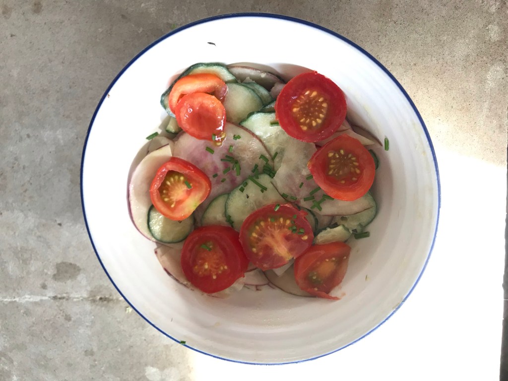 Slice up some cukes and tomatoes. You can also slice up some kohlrabi and candy cane beets like me. I used a mandolin to get my even, thin slices. She finely diced onions, I used chopped chives because I was to lazy to deal with onions. Add salt pepper, and some fresh herbs. She suggests dill, which I didn’t have, so I used thyme. Add a bit of olive oil and sherry vinegar. Then add your cream of choice. Any cream will do: single, double, creme fraiche, oatley’s creme fraiche, yogurt, whatever. Let it sit for an hour or two. I added my tomatoes just before serving because I forgot about them, but still delicious! Done and done.