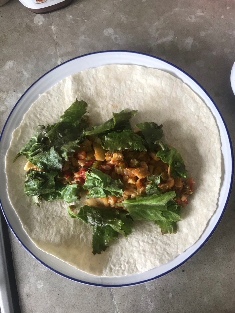While the courgette/zucchini is baking, chop up the leftover courgette/zucchini into small pieces and sauté in a pan with some fresh garlic. I added some lovely tomatoes and fennel from my veg box and sautéed the whole mess for maybe 7-10 mins. Season with some salt and pepper. This can sit in the fridge until you’re ready for your wrap. For a nice breakfast/brunch wrap, add some hummus, sautéed tofu, smoked tofu, or scrambled eggs and topped with veg box lettuce. Just toss the courgette/zucchini mess in the warm pan with your tofu or eggs, or heat it up in the microwave. Done and done.
