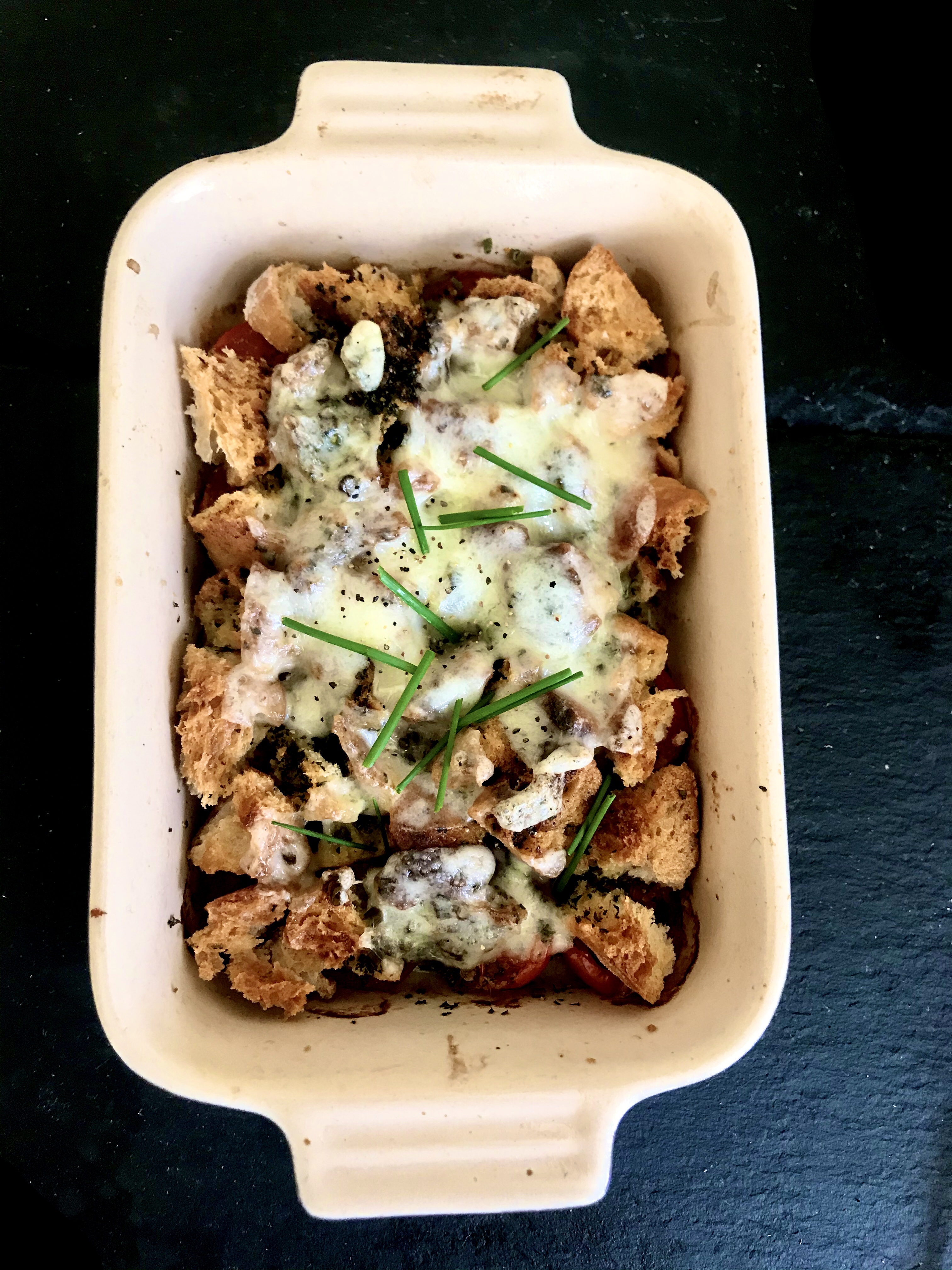 I had an awkward amount of vine tomatoes from my veg box that needed to be eaten immediately. Too many for salad for one, but too few for tomato soup. I also discovered I had a stale ciabatta roll and figured maybe I could put them together in the oven as a yummy dish where the stale bread chunks can soak up some tomato and a bunch of herby infused oil. Turns out, putting stale bread in the oven with bits of non-dairy or dairy cheese, herby garlic olive oil, and tomatoes is a great idea because the chunks of bread become little sponges soaking up the delicious savoury mess when you mix it all around. Here is what you do.