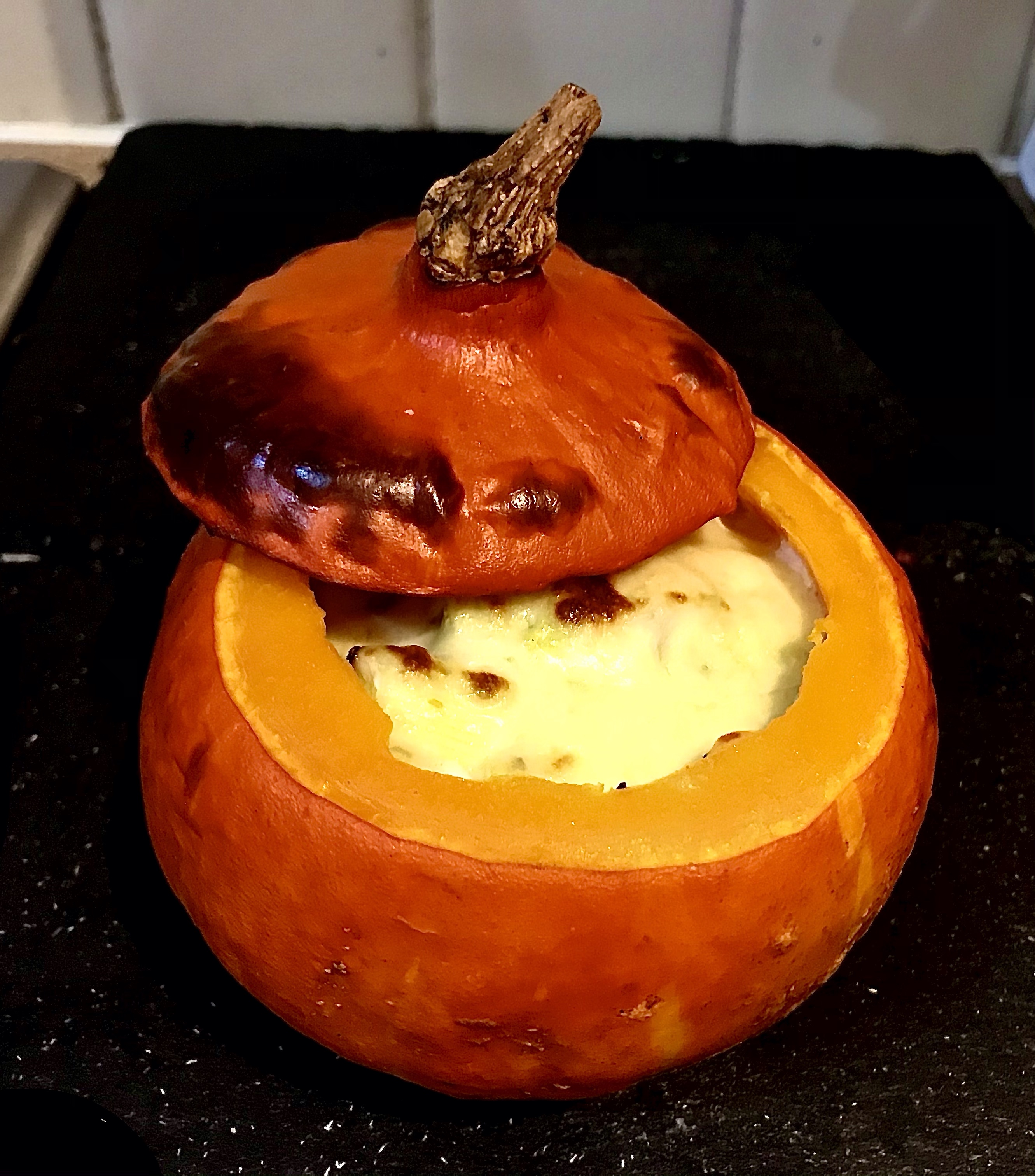 I had a tiny pumpkin from my veg box and saw some fabulous ideas on Instagram for using tiny pumpkins as roasting pots for yummy things. I decided to use mine as a roasting pot for my creamy baked leeks, since I had a bunch of leeks. Such a genius idea, because the pumpkin roasts everything and you get two lovely gratin vegetables in one. What I did was set my oven to 180C/350F, clean out the inside of the pumpkin, clean and chop up leeks and stuff them in the pumpkin and top with non-dairy or dairy cream, salt, pepper, and garlic powder. Cover with lid of pumpkin and let bake for 30-40 mins. Remove and add grated non-dairy or dairy cheese, lemon pepper, herbs,and breadcrumbs if you have them and bake for another 20 mins or so. Delicious!