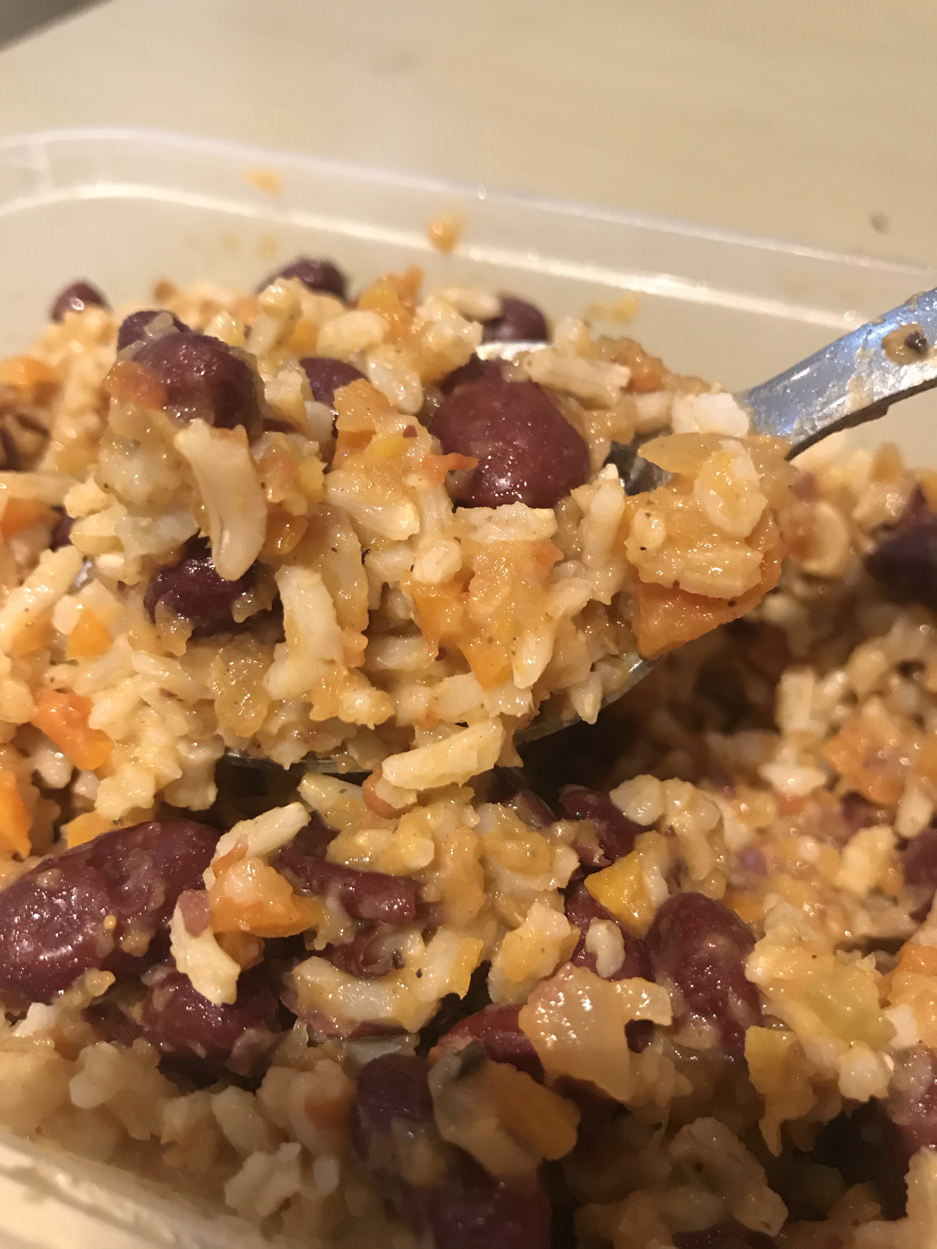 Being extremely lazy, I pulsed a stalk of celery, 2 small/medium carrots, and a small onion, and pepper in my mini food processor until minced. I sautéed it all in some oil with salt, pepper, and Berbere spice mix for about 7-10 mins. While that is cooking, I pulsed 3 medium/large tomatoes in the mini food processor and added that and a can of beans to the sautéed veg and let simmer on medium heat while the rice cooked. Just before serving I added some fat to the beans: butter or non dairy butter or olive oil will do. Mix with rice and you’re done!