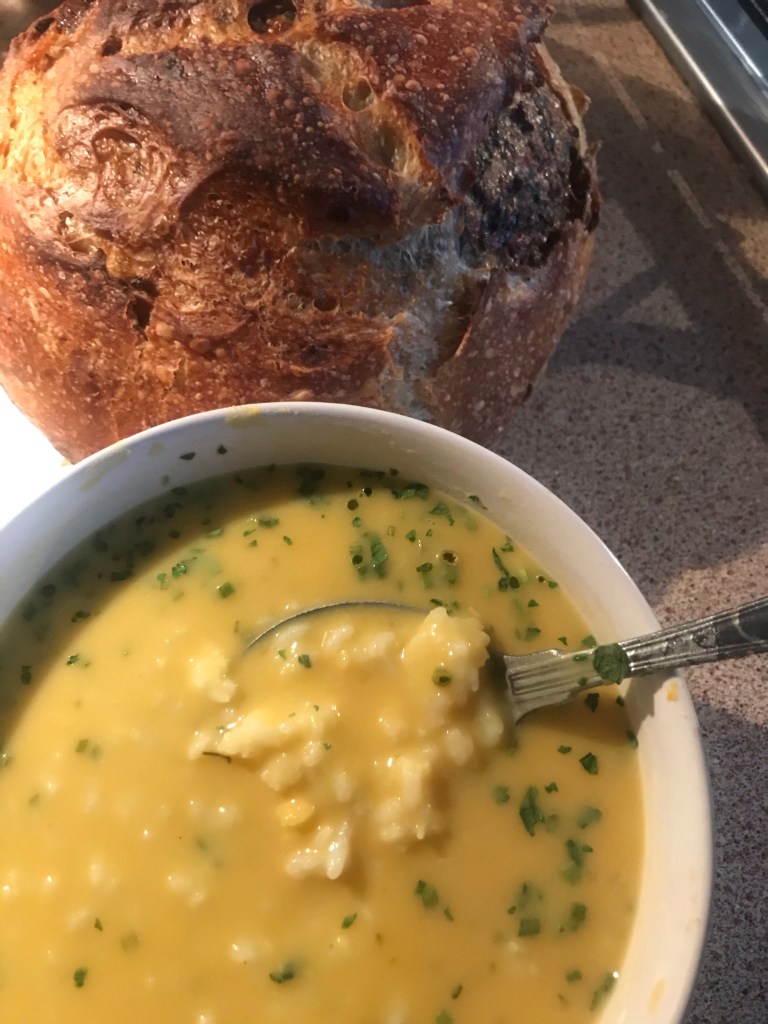 When you are ready to eat, the soup should look like an unappealing, semi-solid yellow lump. Don’t panic, that is right. Put a giant lump of that in a big bowl with some rice, add boiling water, and stir until you achieve the soup consistency you like, because magically, it will return to nice soup. Then microwave to your desired temperature. Garnish with dried chives and dried spinach, season with additional salt and pepper. Done and done.