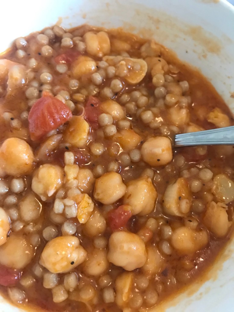 In a pot, heat 2 tablespoons olive oil over medium heat and add 2 roughly chopped cloves of garlic. Cook until it is barely brown. Stir in four heaping tablespoons of chopped or puréed tinned tomato, salt, 2 tablespoons of nutritional yeast, teaspoon of Aleppo pepper, and pepper, and cook them for a minute or so. Add a 1.5 cups (or 15oz tin) of chickpeas, 1/2 c (or 55g) of giant couscous (or any pasta, but I used giant couscous here), and 2c of boiling water, and bring to a boil. Stir to scrape up any browned bits on the bottom of the pot, then lower the heat, and simmer until the pasta is cooked and a lot of the liquid has been absorbed, about 15 to 20 minutes. Top with 2 tablespoons of olive oil. Let rest in the fridge overnight.
