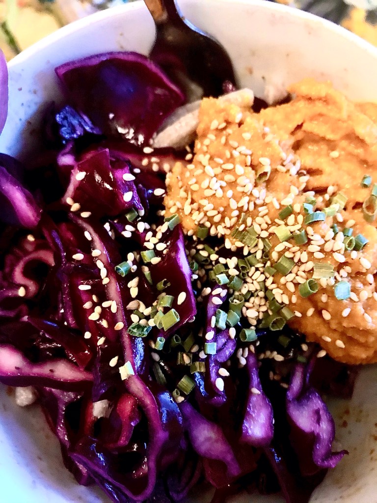 I had some great carrots and red cabbage in my veg box, so I decided to make a quick cold noodle salad using soba noodles. Next time I’ll add some tofu, but feel free to add more yummy things to this base, perhaps nuts and seeds and more veg. Bittman’s carrot dressing is really amazing. I made mine quite thick and chunky, like a pesto rather than a dressing. You might want yours thinner than I have here. Also, he calls for a lot of miso. You might want to taste it after the first tablespoon and then go by teaspoons, just to make sure you aren’t too overwhelmed by the umami. Here is what I did.