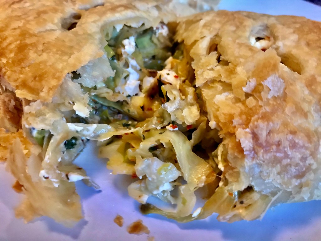 My veg box came with this season’s staples: cabbage and leeks. So I thought I would make a pie. I was looking for filo dough and little Tesco’s didn’t have any so I got some puff pastry. Inside is cabbage, leeks, feta, mustard, caraway seeds, dried spinach flakes, and Aleppo pepper. I think this would also be nice with potatoes or crumbled smoked tofu if non-dairy/dairy feta doesn’t float your boat. It was easy and lovely way to use cabbage and leeks. Here is what I did.