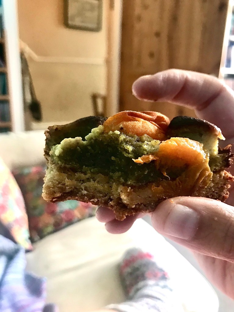 I had bag of luscious apricots in my veg box and I didn’t quite know what to do with them. Apricots are something I would order in a restaurant or buy in a jam, but not something I would normally buy a bag of. I decided to try half this recipe from smitten kitchen, being a single soul. It is absolutely gorgeous. I deeply regret not making a giant pan. It calls for an egg and butter. I think it would be fine with non-dairy butter, but I don’t know how the chemistry works with a frangipane to know what role the egg plays, so I can’t really suggest a substitute here. It would probably be fine with any stone fruit or almonds, but it is absolutely gorgeous with apricots and pistachios. Here is the link to the recipe:
