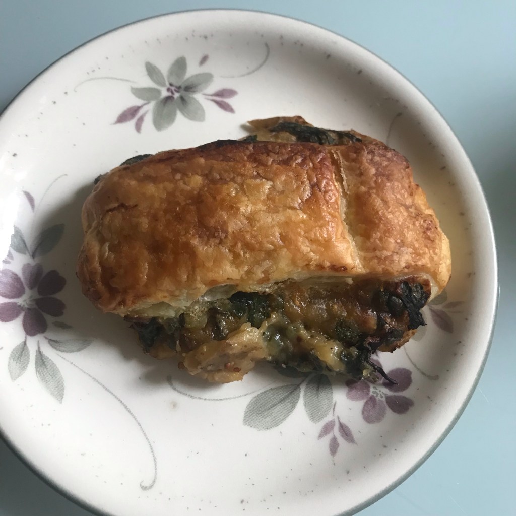 Set some cubed potatoes (cube maybe 5 small/medium potatoes) to boil in salted water and boil until tender enough to mash. While the potatoes are boiling, sauté a chopped onion in oil with a bit of salt until golden, then add chopped spinach (maybe 2 cups) and cook until wilted. Take potatoes off the heat, mash with a bit of non-dairy or dairy milk, a teaspoon of mustard, and a teaspoon of marmite. Just trust me on the marmite, it gives a zip and ramps up the cheesy flavour, rather than making the whole thing taste like marmite. If you’re worried, use half a teaspoon, then taste it and maybe add the other half. Add two handfuls of non-dairy or dairy cheese, pepper, and stir. Then add the onion and spinach mix, stir, adjust seasonings, and let the whole thing cool. It needs to cool otherwise it will melt your pastry.
