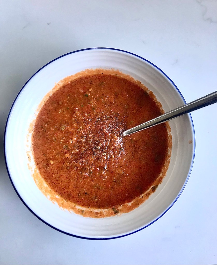 Yah, this is one of those marmite things. Cold puréed tomato soup. You love it or hate it. I love it. I used 6-8 small/medium veg box tomatoes, a small cucumber and roasted red peppers (about the equivalent of one red pepper) gifted to me by a neighbour, 1-2 stalks of celery from the garden, parsley, 1 tsp (or more or less) chipotle chili flakes, 1/2 tsp paprika (or more or less), 1 tbsp red wine vinegar, and lots of olive oil. I dumped the chopped veg and vinegar and a big glug of oil in a food processor (a blender will also do) and blitzed it until I had the consistency I liked. I stirred in another glug of olive oil chipotle flakes, paprika, parsley, salt, and pepper. Taste and adjust seasonings. Let sit in the fridge for a hour or overnight. Done and done.
