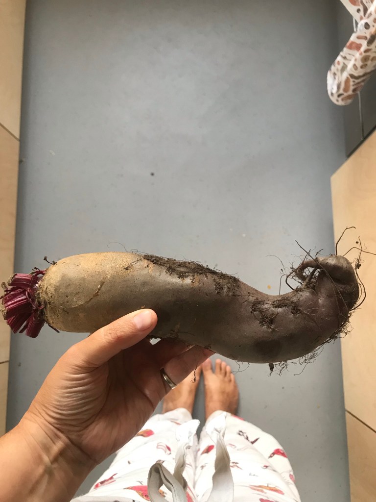 This week I had an absolutely giant beetroot in my veg box. I decided to use some of the beetroot to make a veg soup, since I also had adorable fat, tiny carrots and a veg I had not heard of before called “salsify” which I was told tastes like artichoke, green beans, and some leftover potatoes, tomatoes, courgette/zucchini, and onion from last week. I have a bit of celery and fresh parsley as well. Feel free to add other veg or protein you have kicking around like cabbage or spinach or whatever. It is a very pretty and veg heavy soup. Here is what I did.