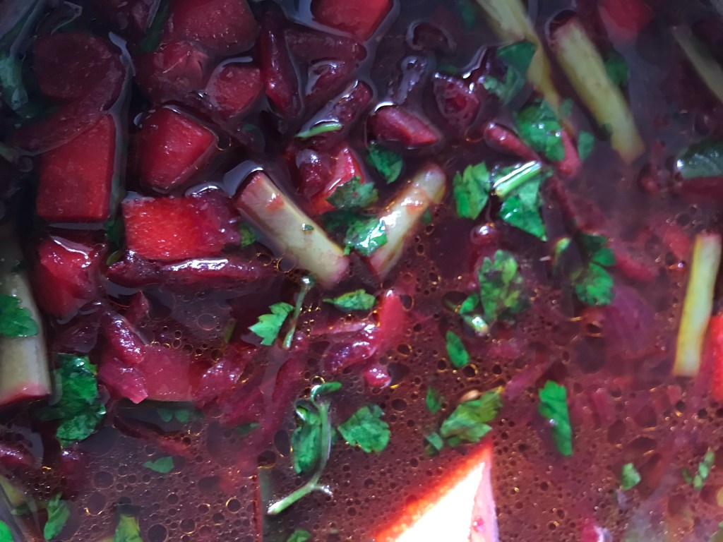 Add chopped tomatoes, shredded beetroot, a good bunch of chopped green beans, veg stock cube (or whatever stock you want, but if you are using mushroom, chicken, or beef, you probably won’t need marmite), a tbsp of marmite, a tablespoon of red wine or balsamic vinegar, and water to cover all the veg. Bring to a boil and then drop temperature and let simmer for at least 20 mins. Taste and add more salt and pepper and more spices if needed. Add fresh chopped parsley and a bit more olive oil. Like most soup, this is even nicer the next day. Serve as is or with a bit of non-dairy/dairy sour cream or yogurt.