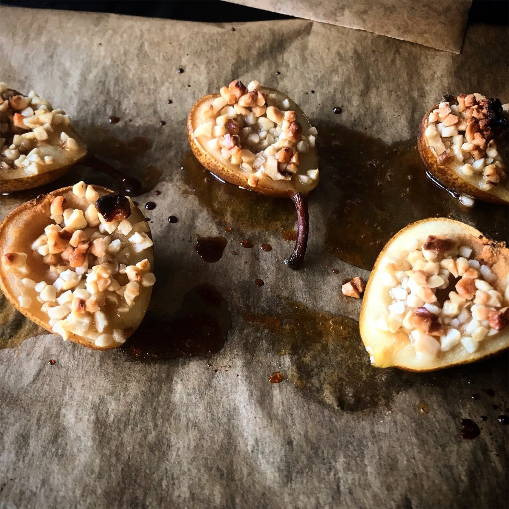 I had wee pears in my box and I decided to make a wee treat. I baked them with a knob of non-dairy/dairy butter, chopped nuts, and a splash of maple syrup. I baked them in the oven at 200C/400F until soft and golden (little pears take about 10mins, regular ones maybe 15-20). Yum.