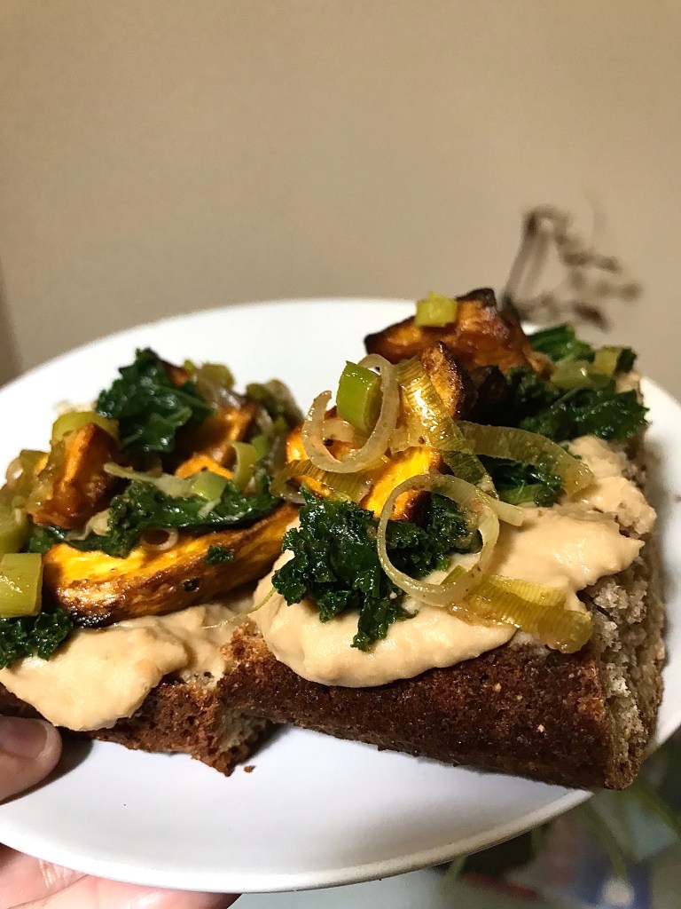 This week I had sweet potatoes in my veg box, so I decided to try Meera Sodha’s recipe for a sweet potato salad with a white bean miso hummus. I also had some kale in my box, which I thought would be a lovely addition and it was. You’ll want to steam it first and then add it to the rest of the mix.