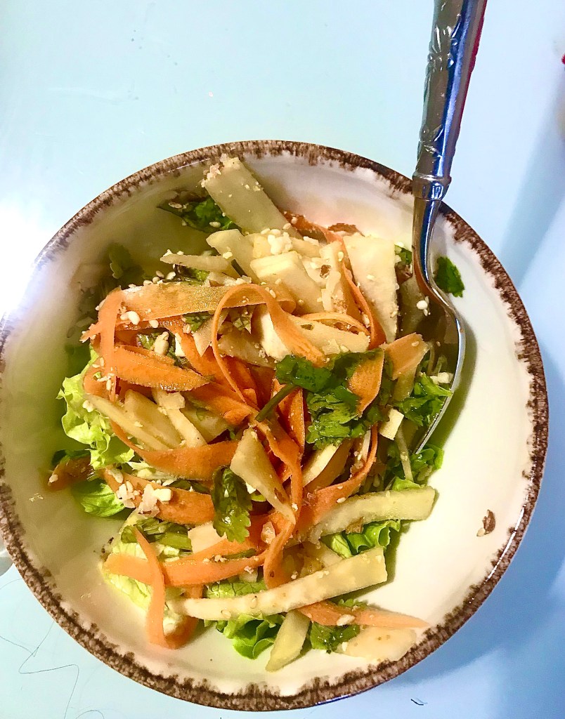 I’m working my way through my big purple kohlrabi, and today I made a sesame slaw salad. I used the same veg box veg (kohlrabi sliced with a mandolin and then chopped into match sticks, fat carrot sliced into ribbons with my peeler) and made a dressing by whisking a tsp of soy sauce, tsp of rice wine vinegar, tbsp of sesame oil, a big squeeze of lime, a sprinkle of Korean dried chilli powder, and some toasted sesame seeds. I tossed the dressing with the carrots and kohlrabi and dumped it all on the lettuce. I sprinkled some crushed peanuts and chopped cilantro on top for some crunch and flavour. Done and done!