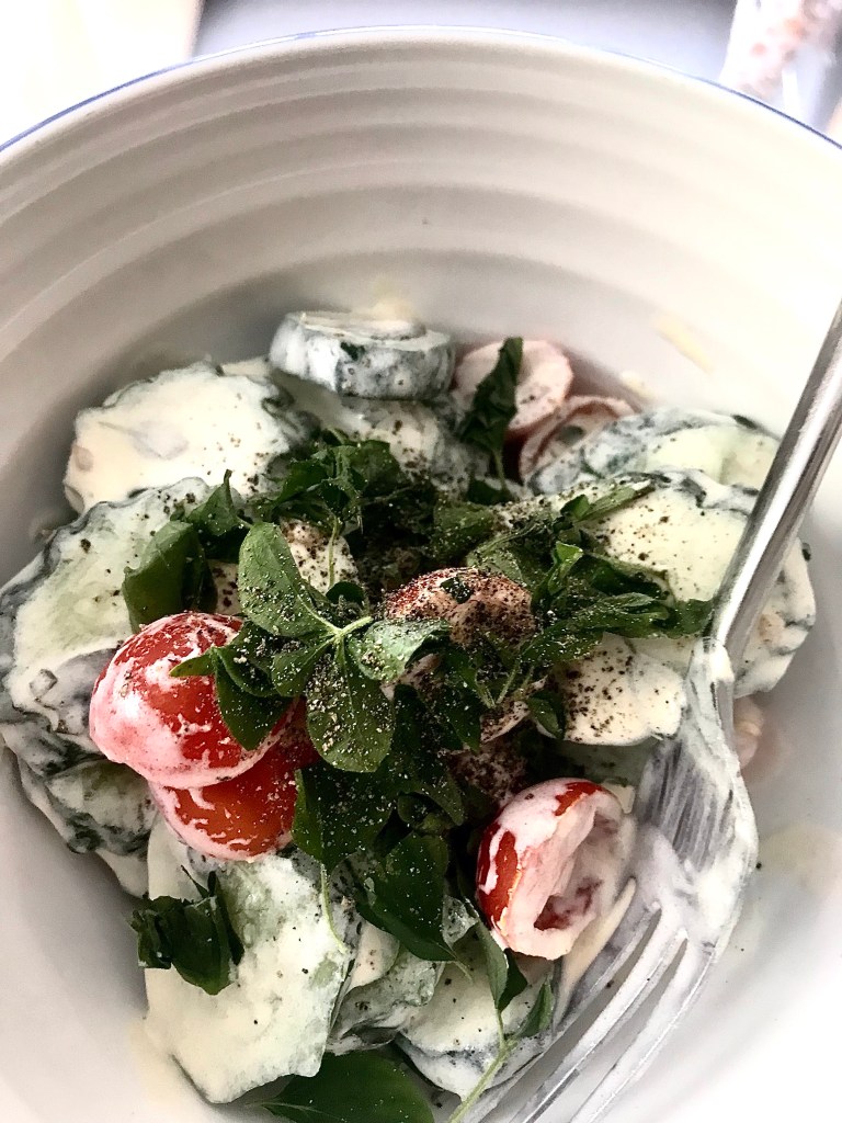 Slice thinly a large cucumber, or a bunch of baby ones to make the equivalent of a large cucumber. Dice up 2 or 3 large tomatoes or the equivalent in cherry or grape tomatoes. Dice up 1/8-1/4 of a small onion (depending on how much onion you like). Put the veg in a big bowl. In another bowl add about 1/4 cup of non-dairy of dairy sour cream or yogurt (if you’re using non dairy, I would use oat or soy or something neutral, not coconut, so it doesn’t come out tasting of coconut), 1.5 tablespoons of white wine vinegar (or any nice vinegar), 1.5 generous tablespoon of olive oil, salt, pepper, and some chopped herbs (dill is nice, but any chopped herbs will do). Mix the dressing up and add it to the veg. Mix around and let sit for at least an hour in the fridge. Garnish with addition herbs, and extra salt and pepper if needed before serving. Done and done!