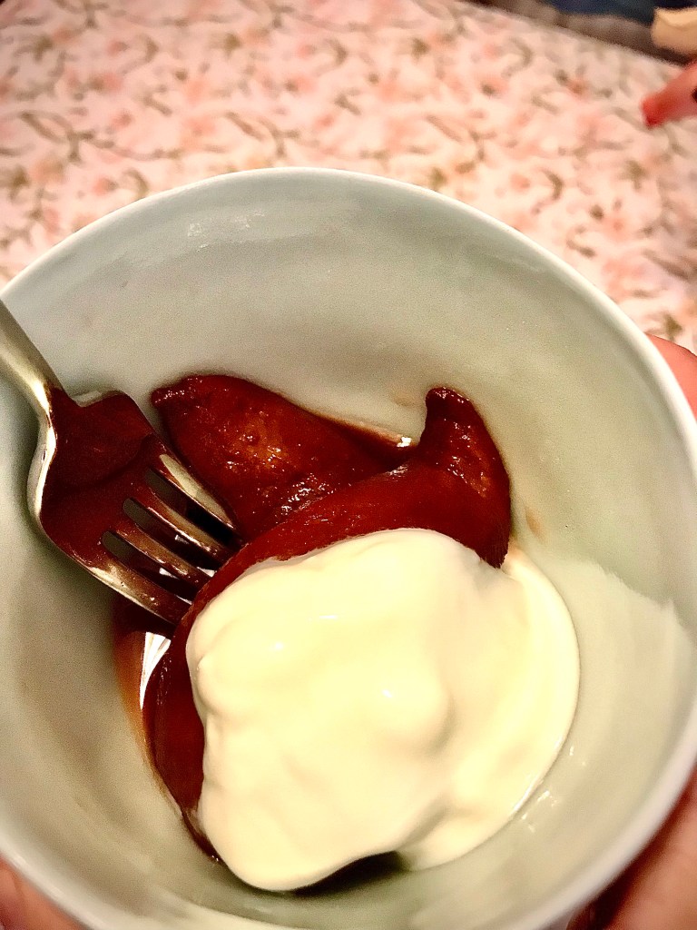 I often struggle with what to do with all my lovely vegbox pears. Last night I decided to poach them so I could have them for breakfast this morning. Usually you get the great colour with wine, but since they are breakfast pears, I used tea, an orange and it’s peel (from my vegbox), a 1/2 inch of veg box ginger I sliced, a few hibiscus leaves for colour, 4 green cardamom pods, some star anise, a couple of cinnamon sticks, 1/4 c of sugar, and a couple of tea bags. I did this all in my instant pot, but you can just as easily do this in a regular pot. Here is what I did.