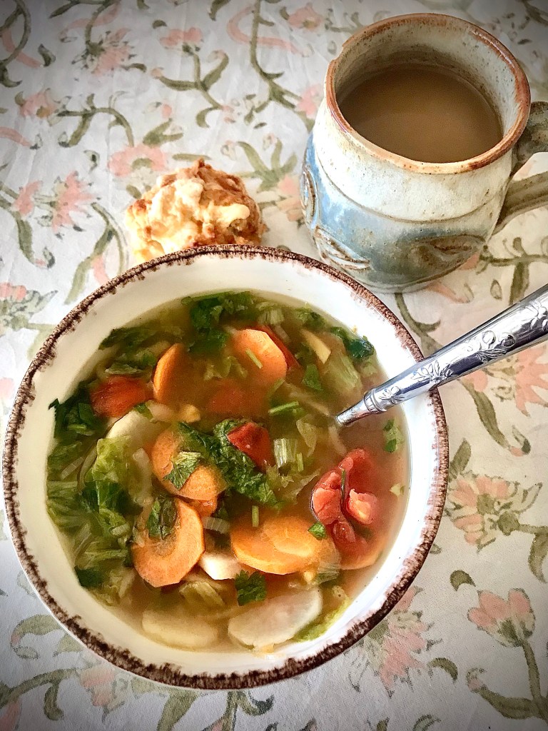 So I had a few odds and sods to use up from my veg box and I don’t like to let any of my nice veg go to waste, so I decided to make some clear soup with lots of ginger from my box and Chinese 5 spice, which I really enjoy and don’t use nearly enough. I had some great veg to add to this: mooli (a kind of big long radish that looks like a white carrot), carrot, part of a red pepper, onion, and the remains of some curly lettuce for greens. I also added fresh ginger, fresh coriander, and a bit of miso and leftover tinned tomatoes (maybe 1/4c) and a stock cube. Here is what I did. I sliced the onion, carrot, and mooli with my mandolin. I set the onions to sweat with some neutral oil and Chinese 5 spice. Then I added my red pepper, ginger, and mixed it around a bit. Then I added water, miso, tomato, and the stock cube and brought it all to a boil. Then added the carrots and mooli and let it simmer for a bit while I cut the lettuce and coriander. I added the lettuce and coriander and let it very gently simmer and tasted to adjust the seasoning. I like a lot of ginger and 5 spice, so I added more and then added some more salt. This would also be nice with some noodles, but I just had it plain right now as a mid morning snack. Done and done.